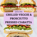 This pressed eggplant sandwich features grilled vegetables, creamy buffalo mozzarella, savory prosciutto, and rich Parmesan cheese, all layered inside crusty ciabatta bread spread with flavorful basil pesto. The sandwich is pressed to meld the ingredients together, creating a delicious and satisfying Italian-inspired meal perfect for lunch or a light dinner.