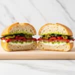 - Prepare the Bread: Slice the ciabatta loaf in half lengthwise. Spread the basil pesto evenly onto the top half of the bread.