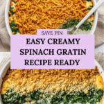Keywords: Spinach gratin, creamy spinach casserole, quick spinach side dish, baked spinach, holiday side dish, easy spinach recipe