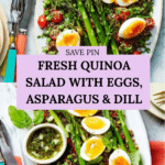 This quinoa salad with eggs and dill is a fresh and satisfying meal packed with vibrant flavors and nutritious ingredients. Perfect for lunch or a light dinner, it combines tender asparagus, juicy cherry tomatoes, and fragrant herbs for a delicious, healthy dish.