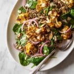 - Step 6: Add the roasted cauliflower, sliced red onion, and spinach or arugula to the lentils. Toss gently to combine. Transfer to a serving platter, sprinkle with toasted almonds, and drizzle with the remaining tahini dressing.