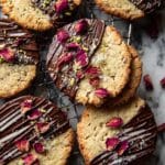 The image shows several round, golden-brown cookies with a slightly rough texture, placed on a dark wire cooling rack over a white marbled surface. Each cookie is half-coated with dark or white chocolate drizzled in thin lines across the top, adding a shiny texture. Some cookies are decorated with coarse sea salt flakes, crushed green pistachios, or dried red rose petals scattered on the chocolate part or near the edges. The cookies have a gentle crisp look, some broken pieces visible, giving a rustic feel. photo taken with an iphone --ar 4:5 --v 7