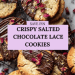 Salted Chocolate Lace Cookies are delicate, thin, and crispy treats made with browned butter, almond flour, and sweetened condensed milk, baked to golden perfection. They are sandwiched with rich melted chocolate and finished with optional sea salt flakes or chopped pistachios for a perfect blend of sweet and salty flavors. These cookies are light, lacy, and elegant, ideal for an impressive but simple dessert or snack.