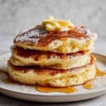 These fluffy Japanese-style soufflé pancakes are thick, airy, and incredibly light, made by folding whipped egg whites into a delicate batter and gently cooking them in a pan with steam to create their characteristic height and softness. Served with butter, icing sugar, and maple syrup, they make a perfect indulgent breakfast or brunch treat.
