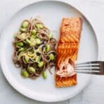 Keywords: salmon, soy sauce, ginger, soba noodles, soya beans, Asian recipe, quick dinner, healthy seafood