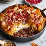 A fragrant and hearty spiced lamb pie combining tender lamb shoulder cooked slowly in a blend of Moroccan spices, tomatoes, and pomegranate molasses, topped with crisp, buttery filo pastry and garnished with crunchy almonds and jewel-like pomegranate seeds. Perfect for a comforting yet exotic meal.