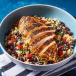 This Spicy Chicken with Coconut Rice & Beans recipe combines tender, flavorful chicken marinated in a blend of aromatic spices with creamy coconut-infused brown basmati rice and hearty red kidney beans. It’s a deliciously balanced one-pan meal perfect for a satisfying lunch or dinner, featuring vibrant Caribbean-inspired flavors and a comforting texture.