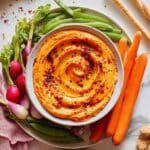 This Spicy Sweet Potato Hummus is a vibrant twist on traditional hummus, featuring roasted sweet potatoes combined with tahini, smoked paprika, and chili flakes for a smoky, slightly spicy flavor. Perfect as a healthy dip served with vegetable crudités, breadsticks, crackers, or olives.