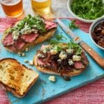 - Step 6: Spread each slice of toasted sourdough with the blue cheese mixture. Top with sliced steak, sticky onions, and a handful of rocket leaves. Finish with a grind of black pepper and serve two open-faced sandwiches per person.
