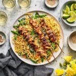 - Serve: Arrange the grilled chicken skewers on top of the noodle salad on a large platter. Serve with extra lime wedges for squeezing over the chicken and noodles for an added zesty kick.