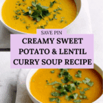 Keywords: sweet potato soup, red lentil soup, vegetarian soup, curry soup, healthy soup, autumn recipe