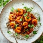 This tamarind prawn curry is a vibrant and tangy dish that combines succulent prawns with a fragrant, spiced tomato sauce. Perfect for a quick weeknight dinner, it’s served over fluffy basmati rice and garnished with fresh coriander for a burst of freshness.
