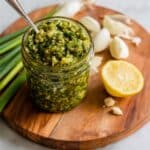 This tangy leek and olive gremolata sauce is a bright, flavorful condiment that instantly elevates simple dishes. Packed with fresh herbs, lemon, and savory olives, it’s perfect for adding a zesty punch to eggs, fish, chicken, and more.