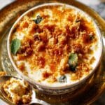 A round bowl filled with a creamy, thick mixture that looks like curd or porridge, with yellowish and white colors swirled together. On top, there are small golden-brown crunchy crumbs scattered unevenly, giving a rough texture. There are also some green leaves tucked into the creamy base, adding a fresh touch. The bowl sits on a gold-colored decorated metal round tray, and on the upper right side of the image, a silver spoon with some crumbs resting on it is visible. The background under the tray is a white marbled texture. photo taken with an iphone --ar 4:5 --v 7