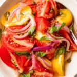 This vibrant Tomato and Onion Salad features fresh tomatoes, thinly sliced red onion, capers, and aromatic herbs tossed in a tangy homemade tomato dressing. The dressing blends fresh tomatoes with Dijon mustard, white wine vinegar, and extra virgin olive oil, creating a flavorful and refreshing salad perfect as a side or paired with crusty bread, proteins, or pasta.