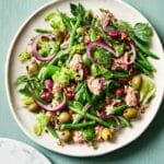 A vibrant and nutritious Tuna, Bean & Olive Salad combining tender green beans, protein-packed tuna, creamy borlotti beans, tangy lemon dressing, and salty green olives for a refreshing and satisfying meal or lunch option.