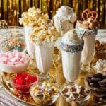 1. Prepare toppings: Tip the mini cookies, sprinkles, marshmallows, pretzels, popcorn, chocolates, and other sweets into separate serving bowls, arranging them on the table alongside the squirty cream so everyone can customize their milkshake.