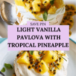 Keywords: vanilla pavlova, meringue dessert, pineapple dessert, passion fruit pavlova, tropical dessert, crème fraîche, summer dessert, easy dessert, baked meringue