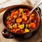 A dark brown ceramic bowl with two handles is filled with a colorful vegetable and meat stew. The stew has visible rounds of orange carrots, pale green celery slices, yellow zucchini pieces, and small chunks of browned meat mixed in a rich, red tomato-based broth. A metal spoon rests in the bowl, its handle leaning against the rim. The bowl sits on a coarse beige cloth on a white marbled surface. photo taken with an iphone --ar 4:5 --v 7