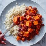 A hearty and flavorful veggie protein chili made with tender sweet potatoes, mixed beans, and warming spices, simmered to perfection and served with nutritious cauliflower rice for a wholesome, comforting meal.